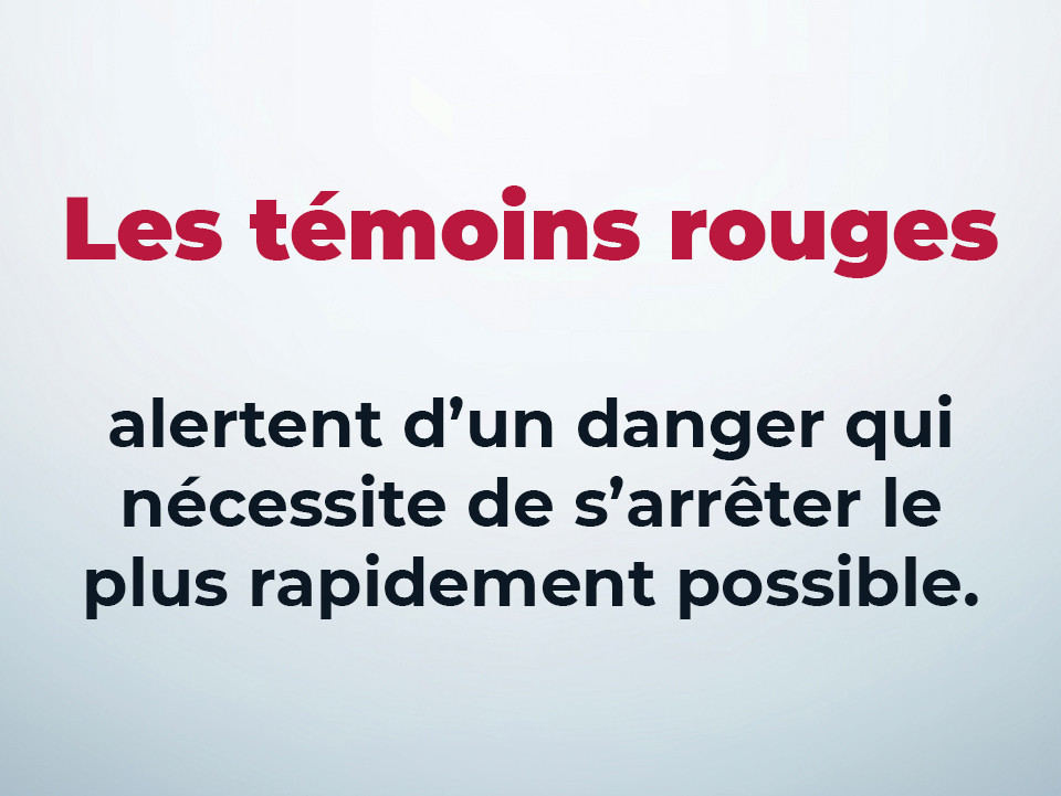 • Témoins lumineux rouges :  Alertent d'un danger qui nécessite de s'arrêter le plus rapidement possible.