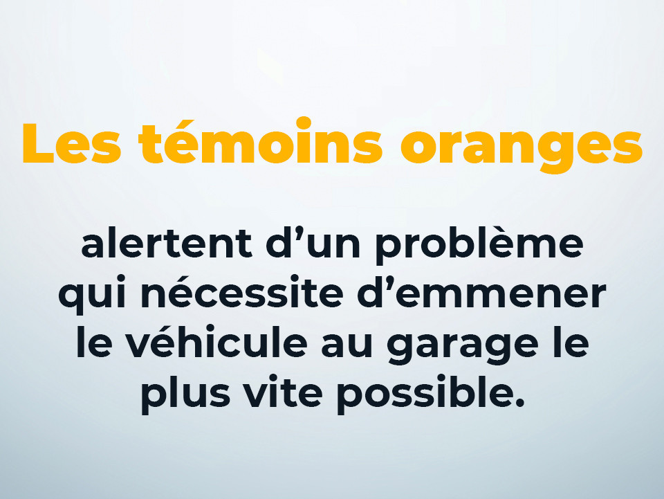 • Témoins lumineux jaunes/oranges :  Alertent d'un problème qui nécessite d'emmener le véhicule au garage le plus vite possible.