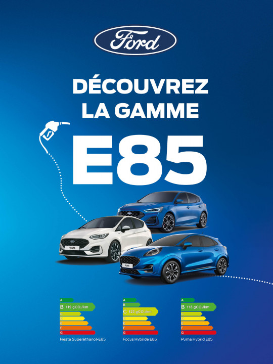 Modèles présentés : Ford Fiesta 5 portes ST-Line X 1.0 Flexifuel 95 ch BVM6 Type 09-21 avec options au prix de 22 790€ TTC (tarif hors option), Ford Puma ST-Line 1.0 Flexifuel Hybrid 125 ch S&S (mHEV) BVM6 Type 02-22 avec options au prix de 24 900 € TTC (tarif hors option), Ford Kuga ST-Line X 2.5 Duratec 190 ch Hybrid Flexifuel (FHEV E85) Type 09-21 avec options au prix de 38 950 € TTC (tarif hors option). Fiesta : Consommations combinées WLTP (l/100 km) : 4,3 - 9,4. CO2 combinés WLTP (g/km) : 112 - 151. Puma : Consommations combinées WLTP (l/100 km) : 4,8 - 9,0. CO2 combinés WLTP (g/km) : 118 - 148. Kuga : Consommations combinées pondérées WLTP (l/100 km) : 1,0 - 8,5. CO2 combinés pondérés WLTP (g/km) : 22 - 135.
