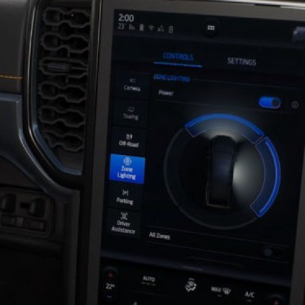 L’éclairage de zone vous permet de contrôler les lumières extérieures via l’écran SYNC4 ou via l’application FordPass. Les feux de croisement avant, l’éclairage d’approche, l’éclairage dans la benne et les feux de plaque d’immatriculation peuvent tous être allumés en même temps, ce qui est idéal pour éviter les risques de chute la nuit. Vous pouvez également utiliser uniquement les lumières dont vous avez besoin pour vous éclairer lors du rangement des outils ou pour un changement de pneu.