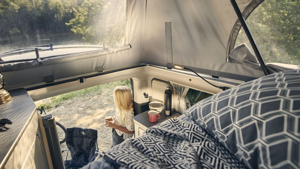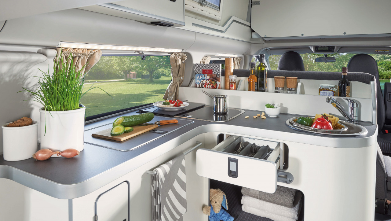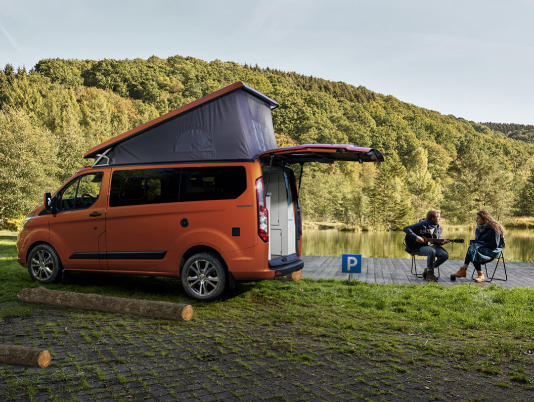 Modèle présenté : Ford Transit Nugget. Consommations NEDC corrélée (l/100 km) : 6,2 - 7,0. CO2 (g/km) : 162 - 182. Consomations WLTP (l/100 km) : 8,2 - 10,4. CO2 (g/km) : 214 - 273,4.