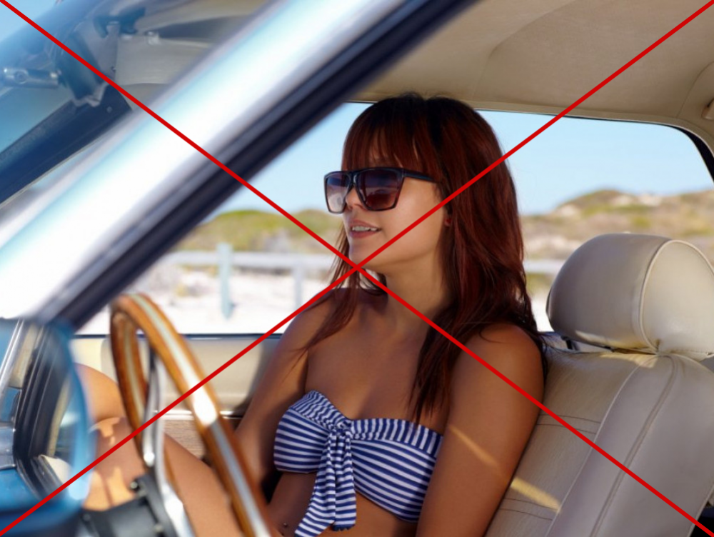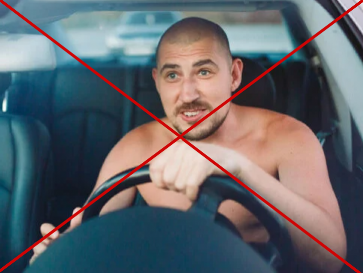 Conduire torse nu ou en maillot de bain n’est techniquement pas interdit non plus : aucune tenue particulière n’est imposée par la loi. Cependant, nous vous conseillons tout de même de conduire avec des vêtements recouvrant. Effectivement, si vous êtes au volant de votre voiture simplement vêtu de votre maillot de bain et que vous êtes victime d’un accident de la route, votre corps dénudé est plus vulnérable aux blessures ou brûlures occasionnées. Il est donc préférable de porter des vêtements qui vous protégeront davantage. De plus, en cas de contrôle d’un agent, ce dernier peut estimer que votre tenue est inappropriée à l’exercice de la conduite en toute sécurité. Cela peut aller jusqu’à l’exhibition sexuelle (dévoiler en public sa nudité) dans les cas de forces majeurs, punie d’un an d’emprisonnement et de 15 000€ d’amende.