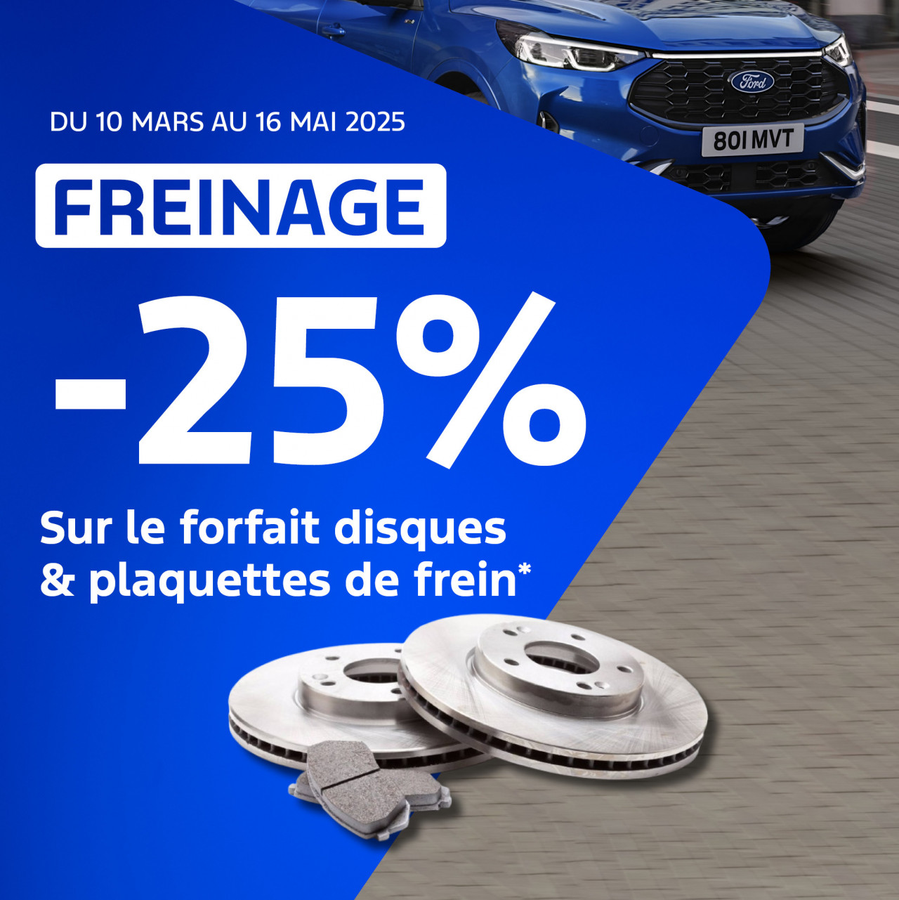 Jusqu'au 16 mai, profitez de 25% de remise sur le forfait disques et plaquettes de frein dans votre concession Ford en prenant RDV en ligne !
