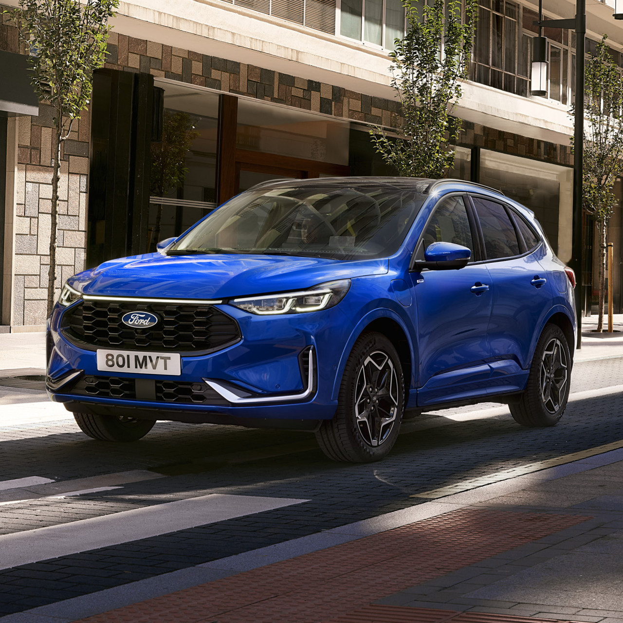 Le design audacieux du nouveau Kuga reflète parfaitement ses capacités étendues. Sa face avant se démarque par une calandre audacieuse, agrémentée d'un bandeau lumineux à LED qui s'intègre harmonieusement dans les nouvelles optiques également à LED. L'ovale bleu trône au centre de la calandre, tandis que le capot présente des lignes plus musclées.